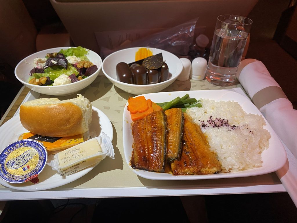 食事は、ウナギが選べた。おいしい、うれしい。楽しい。隣のパンと、チョコレートケーキが合うかどうかは別として…..。