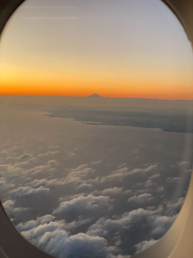 あっという間の9時間半、気づくと、窓の外は夕日。オレンジ色の空に富士山の影が見える。日本に帰ってきたのだ。