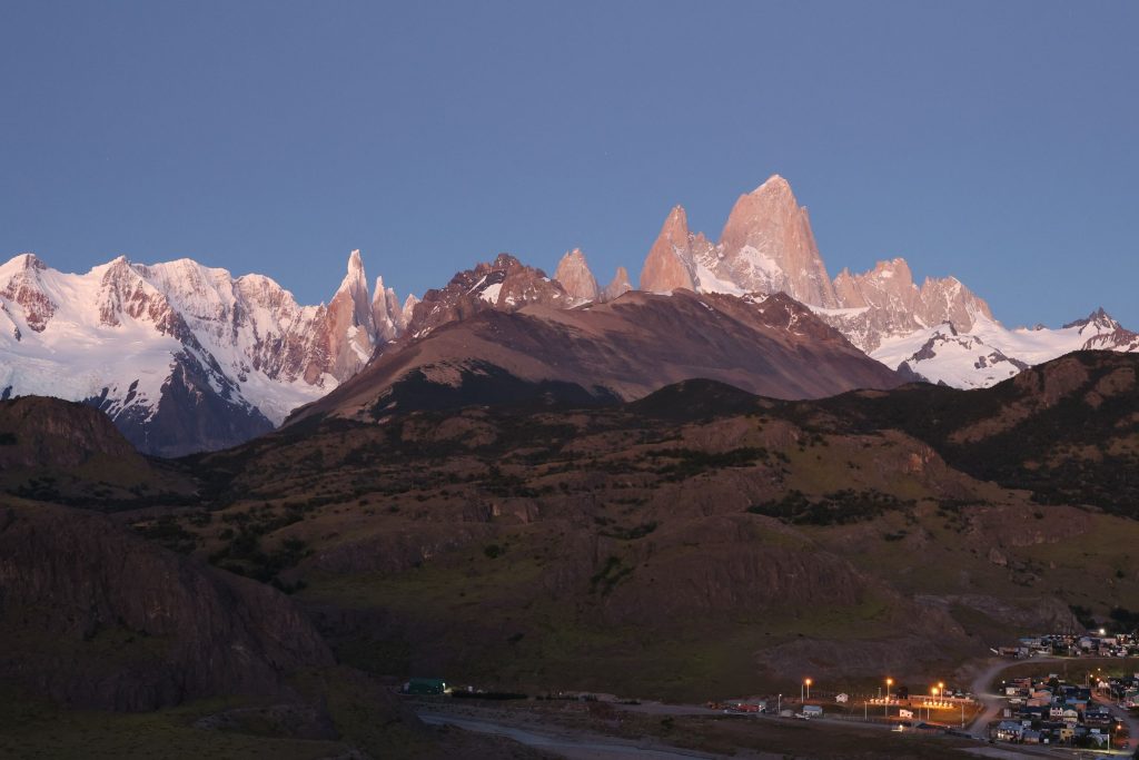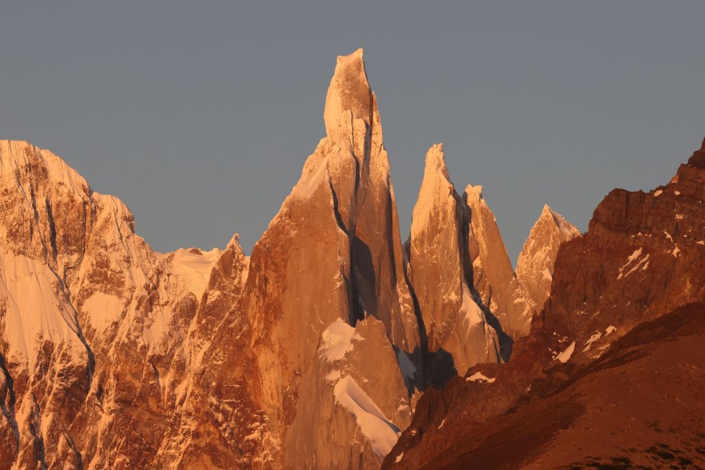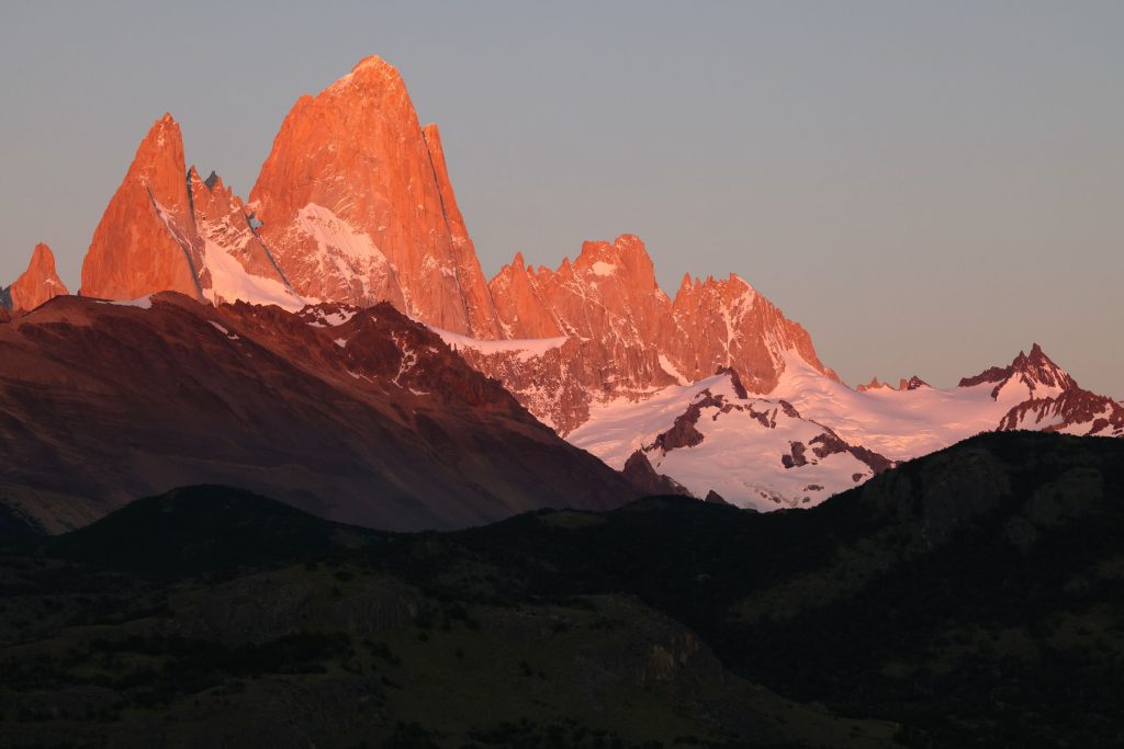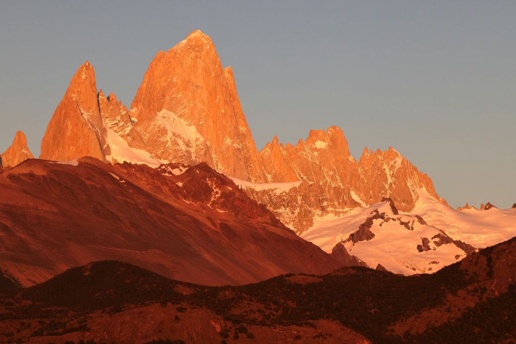 フィッツロイの頂上の先端が、強いオレンジ色に染められる。それから徐々にオレンジ色は下へと下がり、フィッツロイ、そして周りのギザギザの山々を染めていく。
