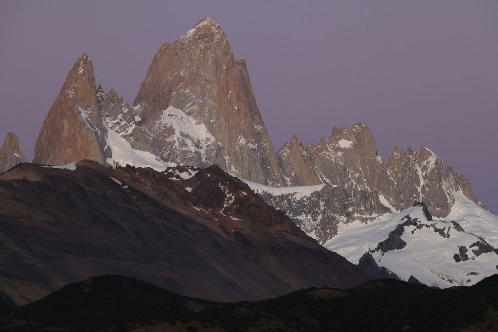 5:30から丘の上で景色を眺める。少し明るくなり始めた空。その静けさの中、山々が静かにたたずむ。山は大きいが、遠くから眺めると空はさらに大きい。目の前にはフィッツロイとセロトーレ。