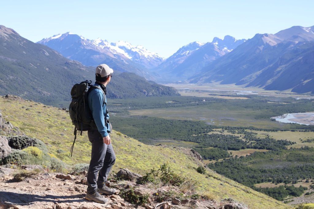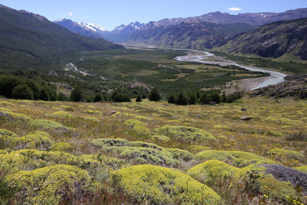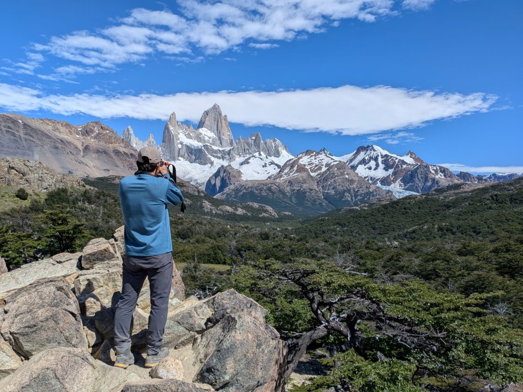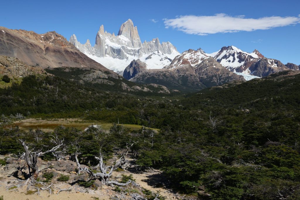 ビューポイントでは、目の前にフィッツロイを望みながら、とにかくのんびりと過ごす。目の前の風に耐える低木の木々。その向こうには、ふもとに氷河とたたえるどっしりとしたフィッツロイの山体。