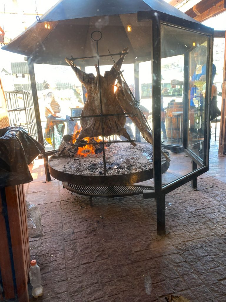 昼食はレストランでいただくことにした。子羊の丸焼きがパタゴニア名物とのこと。店頭で、回りながらそれが薪で焼かれているお店に入る。ラムは苦手だし、回りながら焼かれている子羊も趣味のよいものではない。ただ、名物なのでいただくこととする。保険に、もう一品はビーフバーガーを頼む。