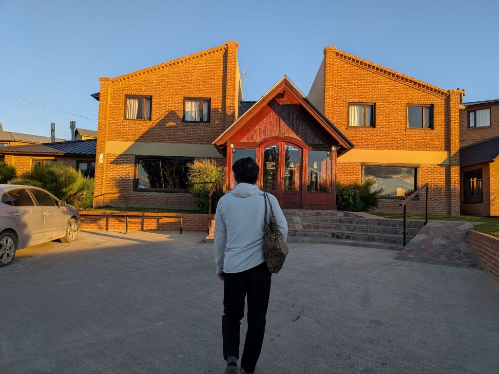 16時のカラファテ行きのバスまでの時間、ホテルの庭で過ごそうとしていたが、ホテルの人から中に入れといわれ、食堂とトイレをかしてもらった。なんかそんなホスピタリティーがとてもうれしい。すこし暖かい気持ちになった。タクシーがホテルに迎えに来る。