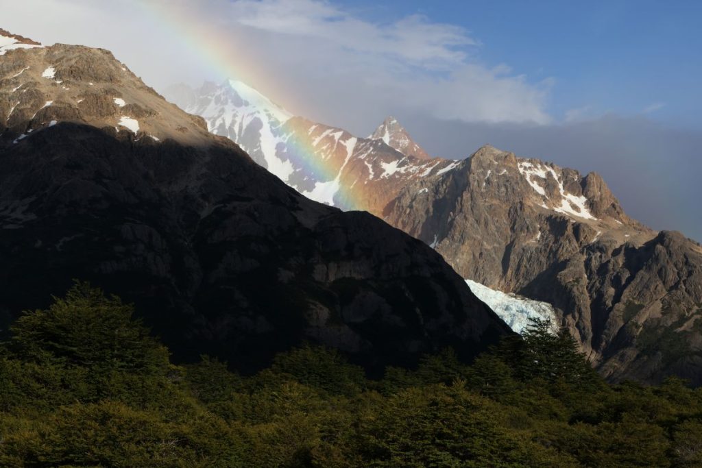 湿気が強いのだろう、流れ落ちる氷河の上には、虹がかかっている。